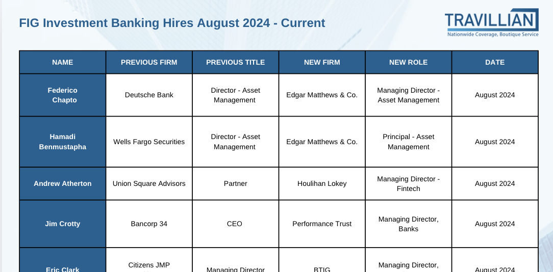 The FIG investment banking hiring landscape is heating back up — driven by a stronger deal environment, private credit expansion, and easing regulation. Travillian’s latest report tracks every U.S. calling officer-level hire over the past year and reveals why the “talent wars” may soon return.